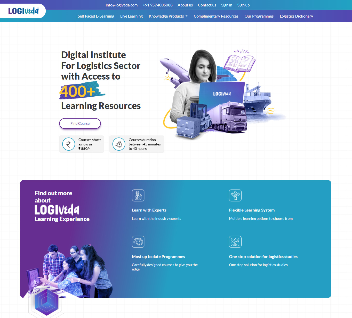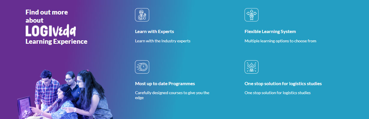 Logiveda is a digital institute dedicated to the logistics sector, offering access to 400+ learning resources including self-paced e-learning courses, live learning programmes, books, eBooks, and audiobooks — all focused on areas like customs clearance, international freight forwarding, shipping, air cargo, and export-import business.